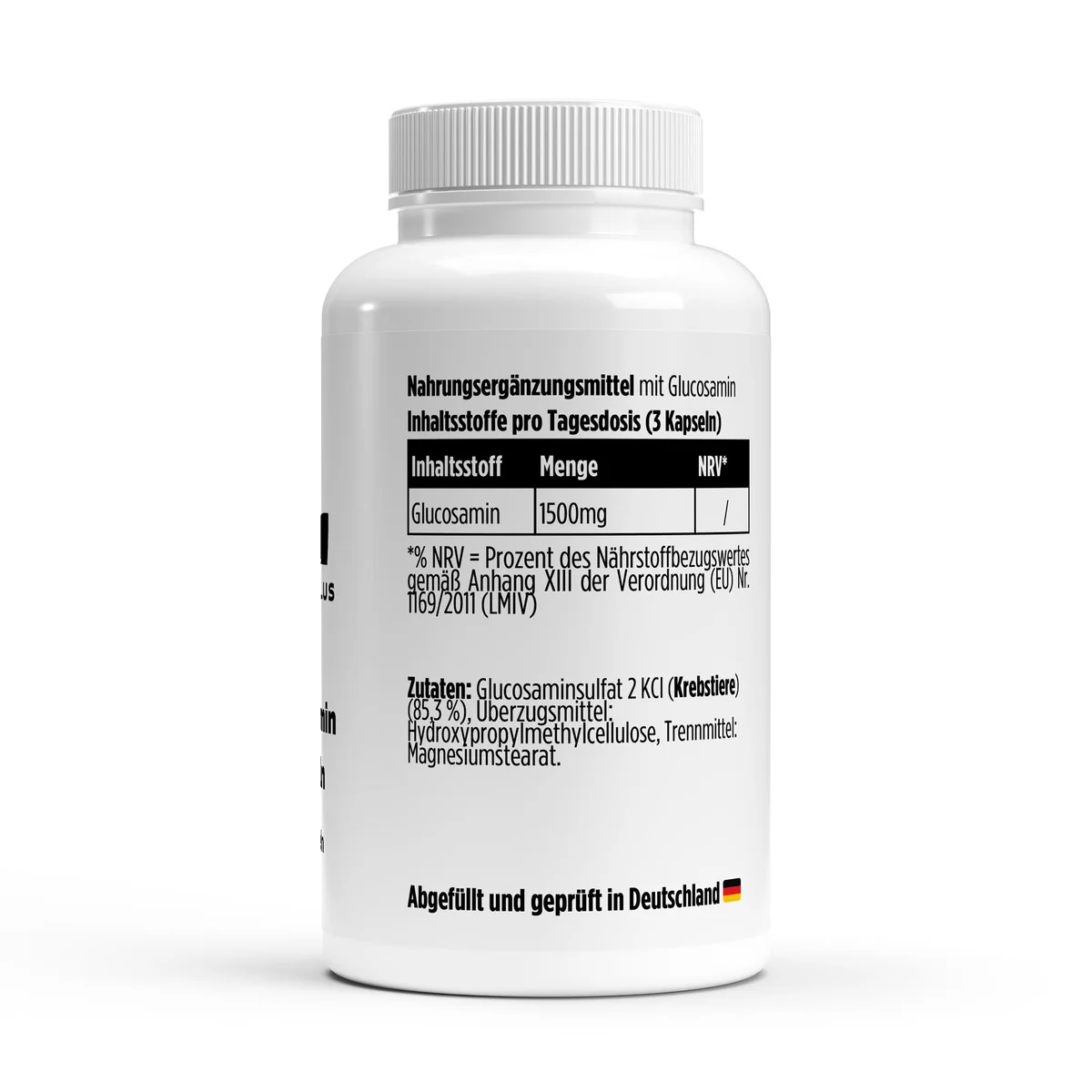 Glucosaminsulfat 2 KCl (Krebstiere) (85,3 %), Überzugsmittel: Hydroxypropylmethylcellulose, Trennmittel: Magnesiumstearat.
