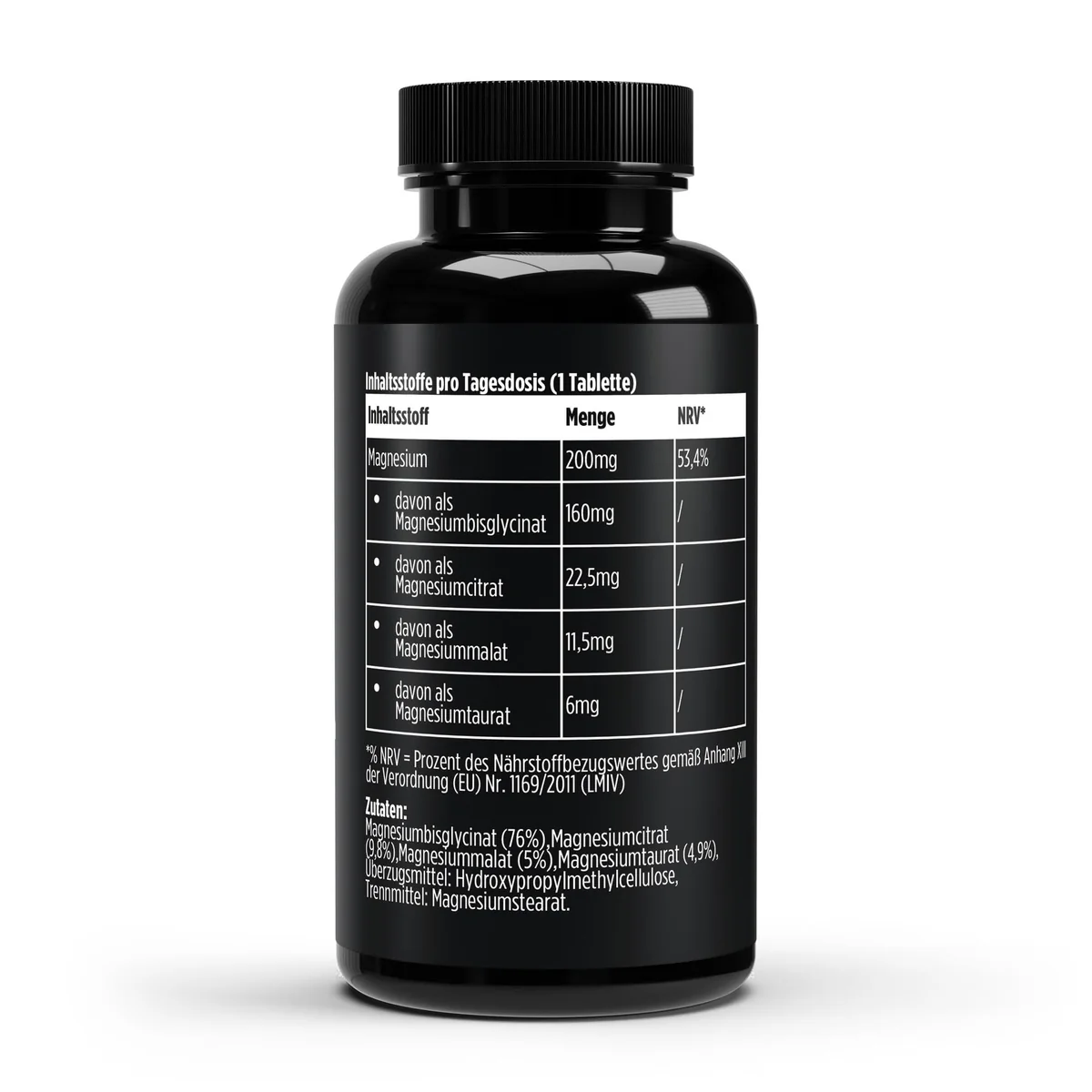 Magnesiumbisglycinat (76 %), Magnesiumcitrat (9,8 %), Magnesiummalat (5 %), Magnesiumtaurat (4,9 %), Überzugsmittel: Hydroxypropylmethylcellulose, Trennmittel: Magnesiumstearat.