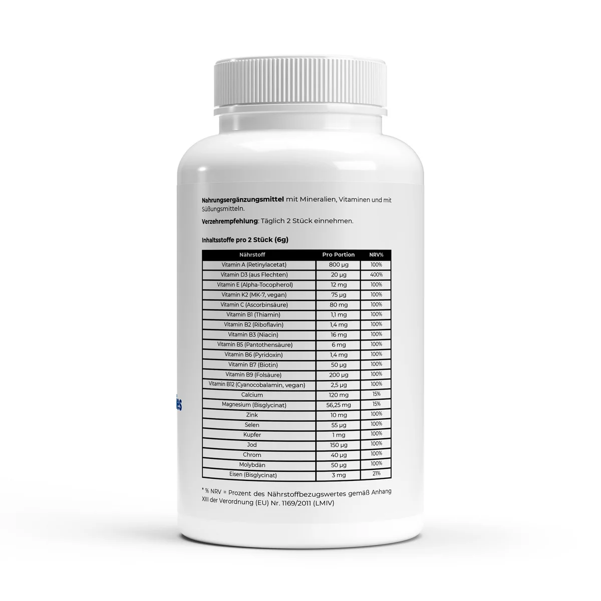- Umfassender Vitamin-Komplex mit A, C, D3, E und wichtigen B-Vitaminen für Energie und Vitalität.