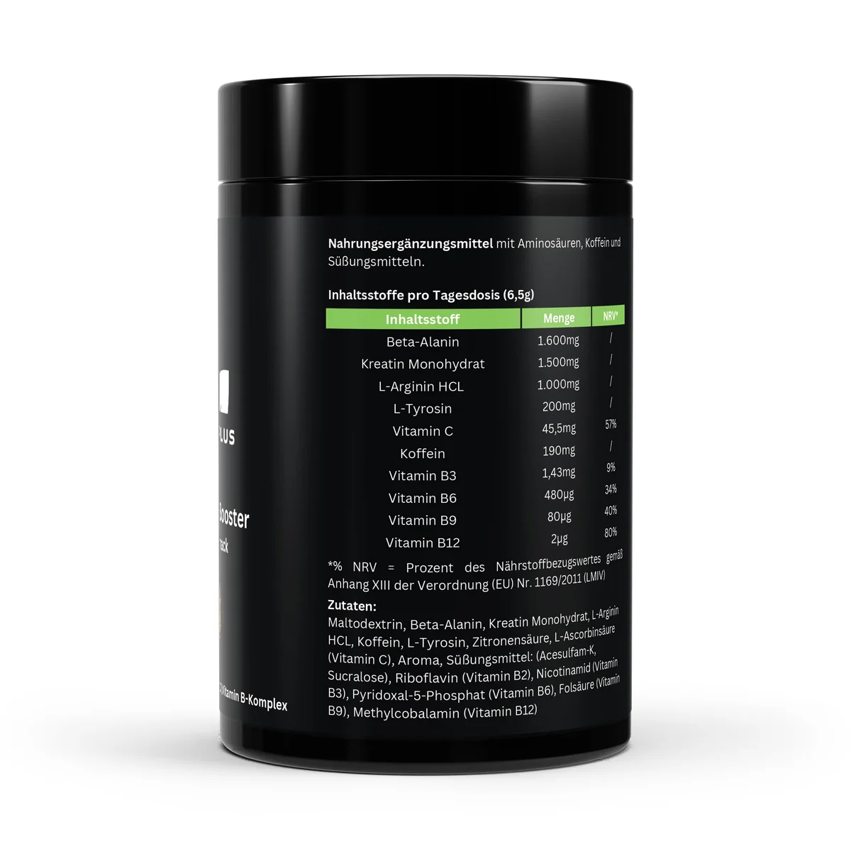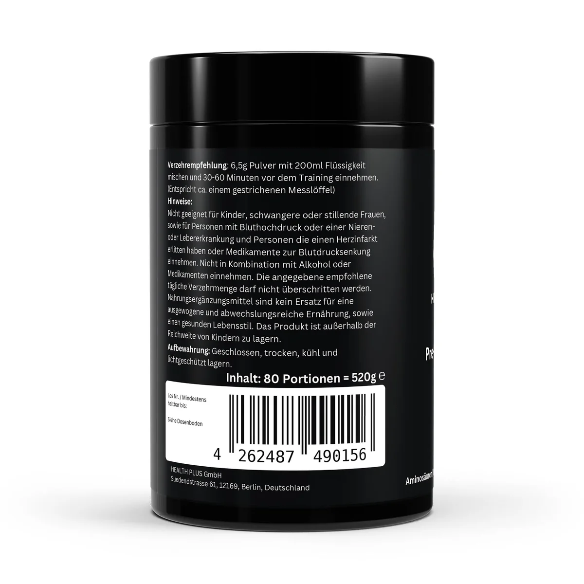 Der Health Plus Pre-Workout Booster enthält eine ausgewogene Kombination aus Beta-Alanin, Kreatin, Aminosäuren, Koffein sowie Vitamin B-Komplex und Vitamin C.