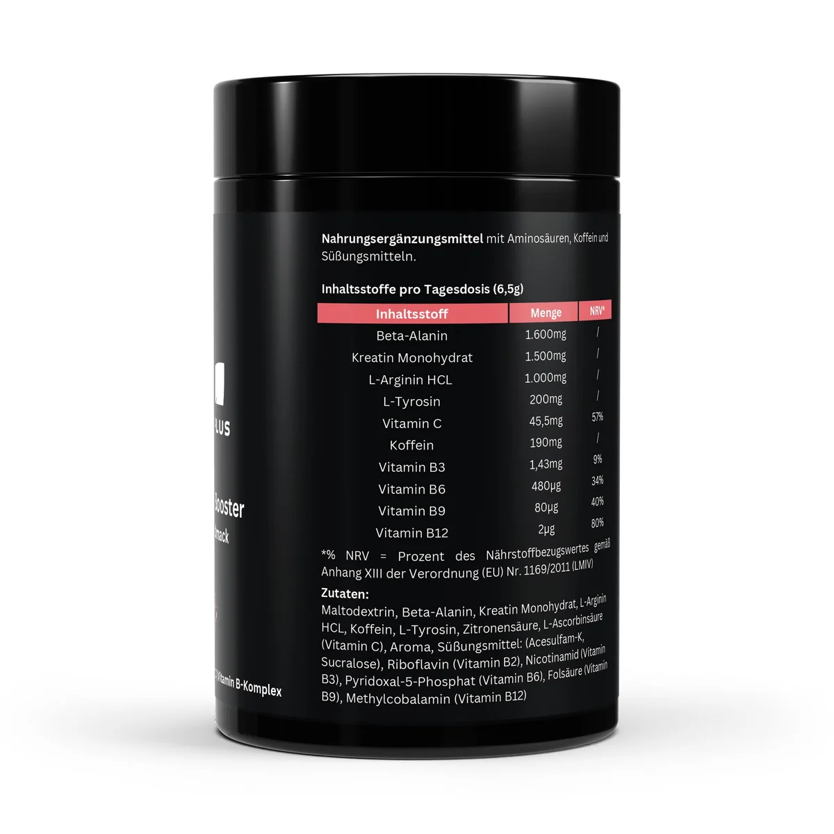 Der Health Plus Pre-Workout Booster enthält eine ausgewogene Kombination aus Beta-Alanin, Kreatin, Aminosäuren, Koffein sowie Vitamin B-Komplex und Vitamin C.